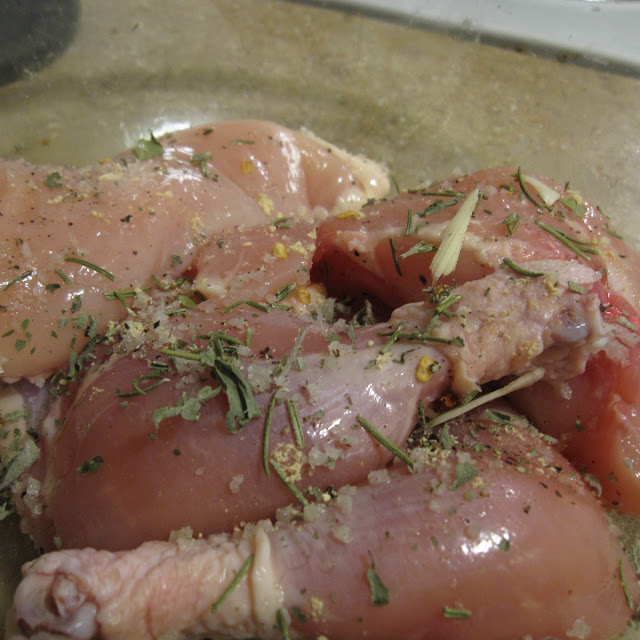 De-fatted and boned chicken breasts and thighs, slathered in Celtic salt, rosemary, basil, dried cayenne and pepper. |